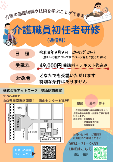 介護の基礎知識や技術を学ぶことができます。詳しい日程についてはPDFファイルをご覧ください。